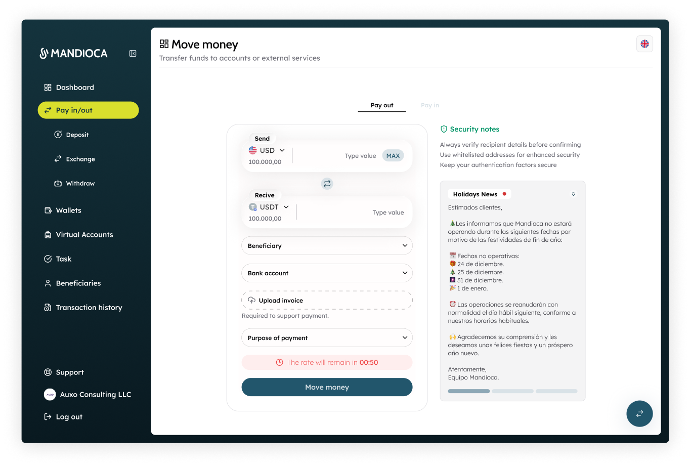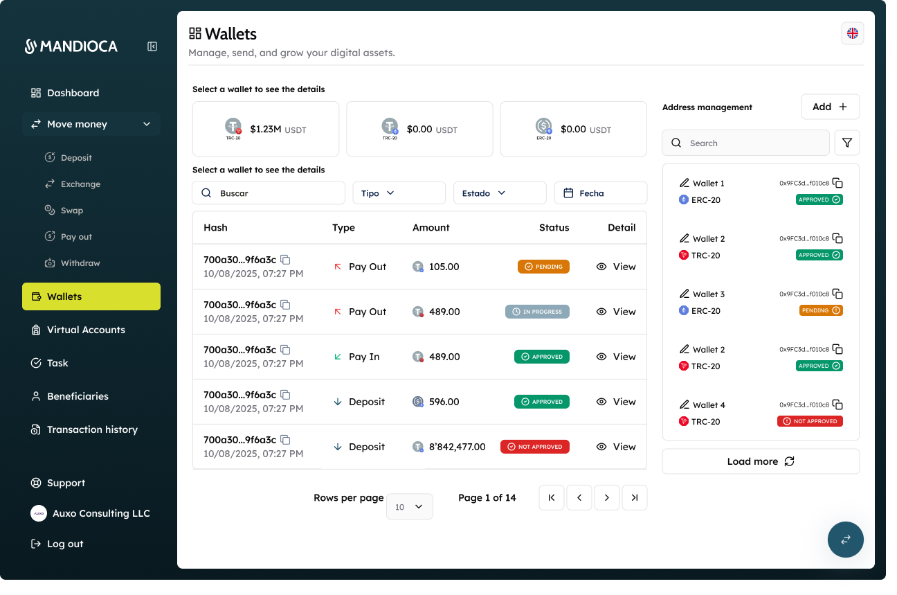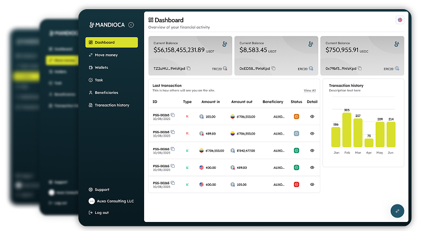 Total visibility and control in real time.Mandioca’s Dashboard lets you track balances, deposits, withdrawals, and activity instantly - all with enterprise-grade security and full AML/KYC compliance.